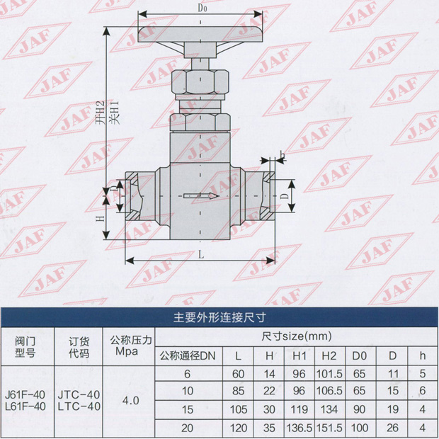 適用范圍 適用于公稱壓力為4.0MPa、公稱通徑為DN6-DN20進(jìn)出口插焊連接、閥體材料為鋼質(zhì)的直通截止閥和節(jié)流閥。 閥門屬性 公稱壓力為4.0MPa,試驗壓力為6.0MPa,適用溫度為-50°C-+200°C適用介質(zhì)為氨、氟等。 J表示截止閥 L表示節(jié)流閥 T表示結(jié)構(gòu)形式為直通式 C表示插焊連接 40代表公稱壓力為4.0MPa 40后不標(biāo)注代表閥體材質(zhì)為鍛鋼。